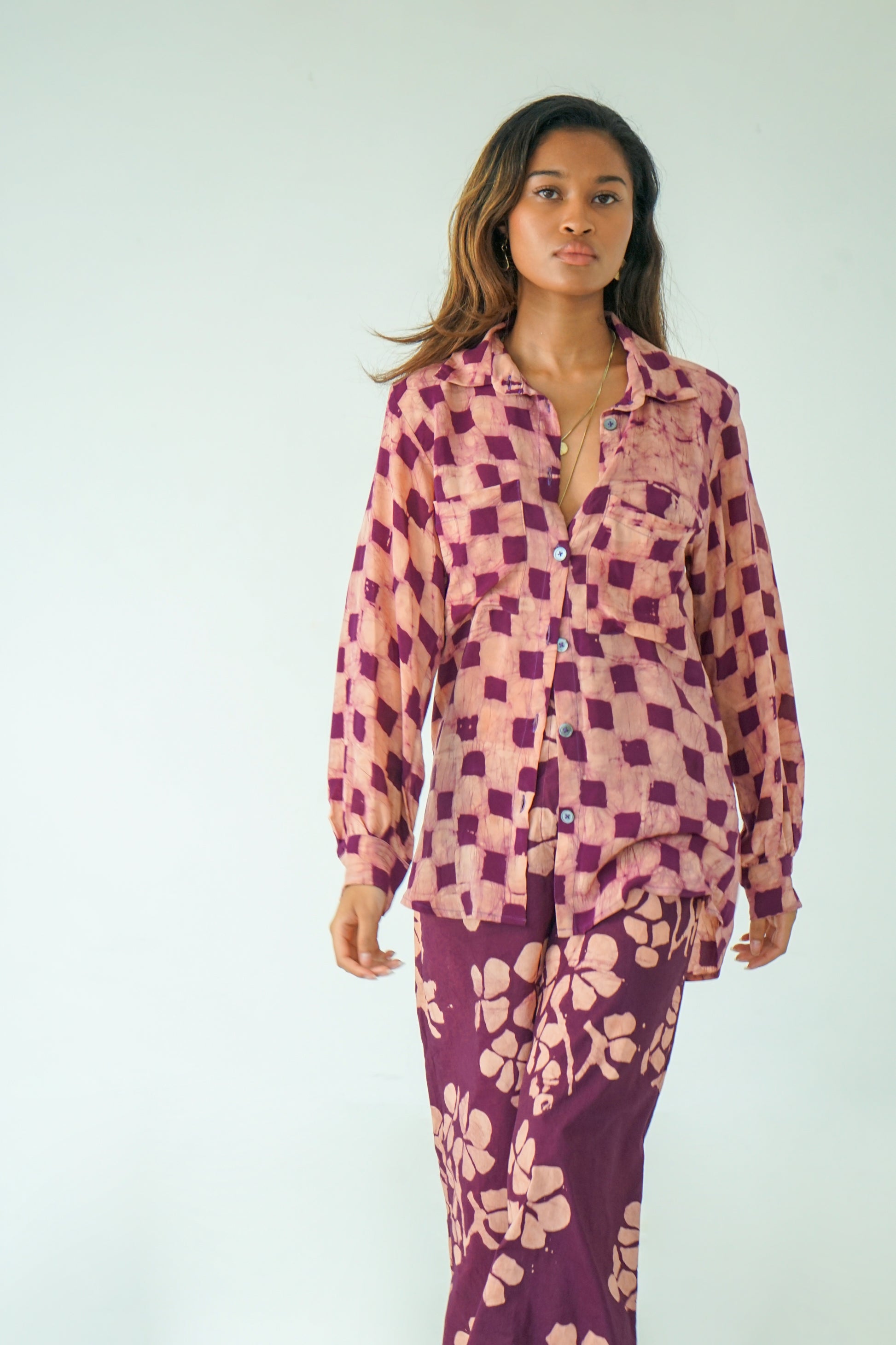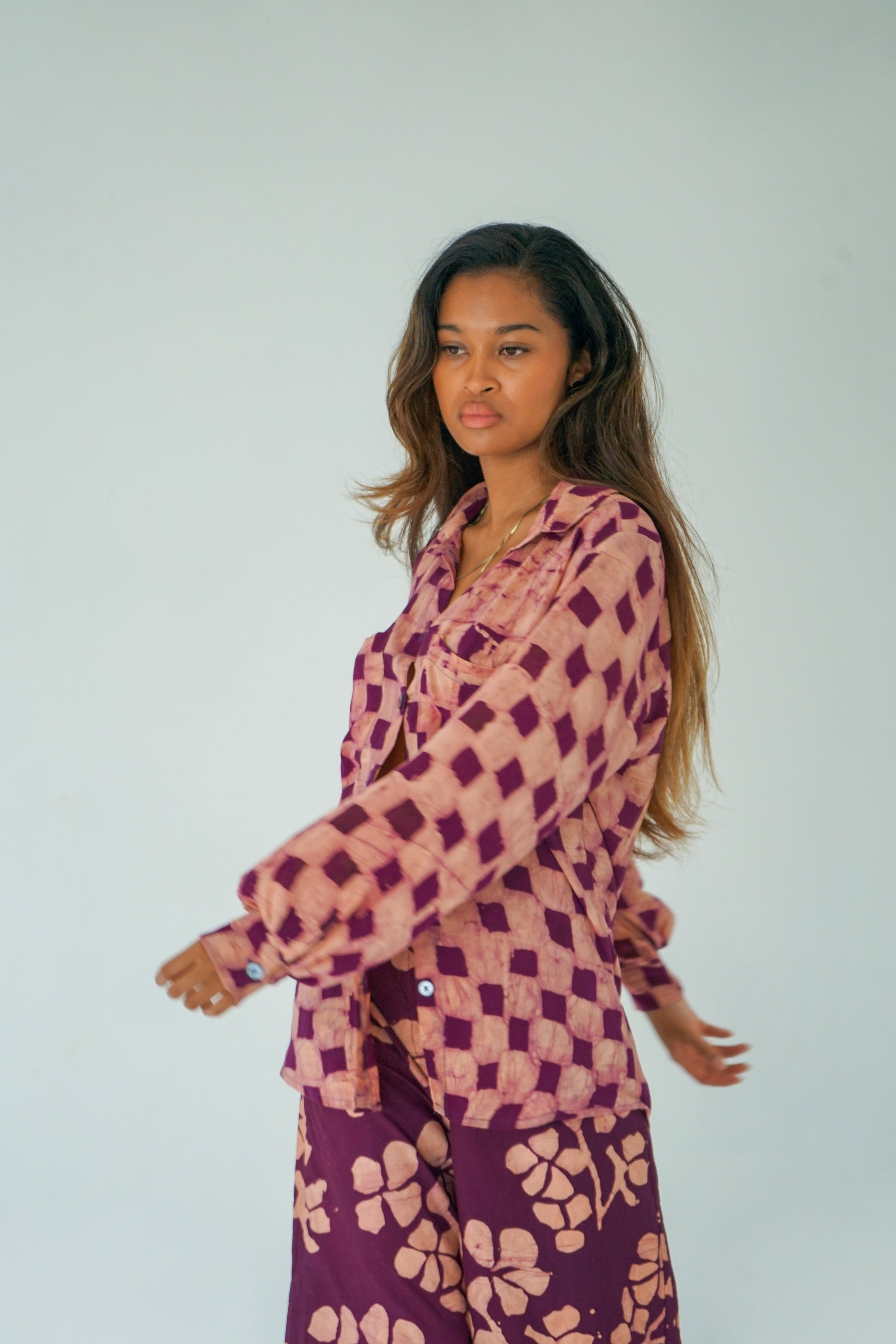 The Nana Shirt showcases hand-dyed silk crafted in Ghana, featuring a striking Moral Print rendered in warm Sunburn and mahogany cherry tones. Each piece reflects the artisanal expertise of skilled dyers who work with natural processes, creating subtle colour variations that enhance the fabric's depth and character. The luxurious silk drapes elegantly whilst the earthy palette offers versatile styling possibilities. A statement piece that celebrates traditional craftsmanship and contemporary design sensibility.